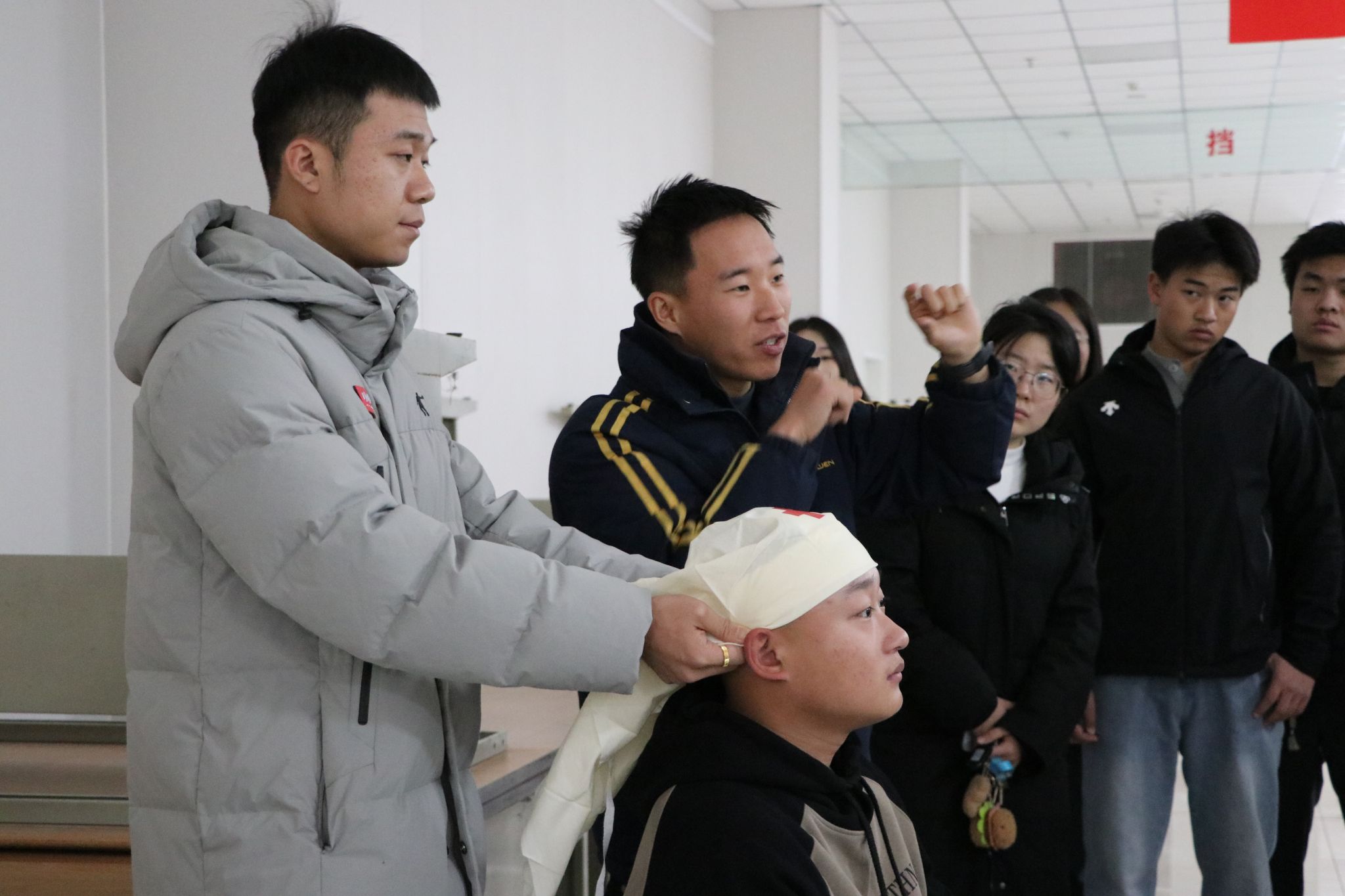 两个小时的密集培训,让参训学生系统掌握了急救实用技能。从理论到演示,再到一对一指导,每位学员均完成“知识—技能—信心”的闭环提升,应急意识与责任担当同步扎根。国旗护卫队员们和我校退役士兵也以专业表现彰显“平时能奉献、急时能冲锋”的志愿精神,为校园安全再添一道坚实屏障。