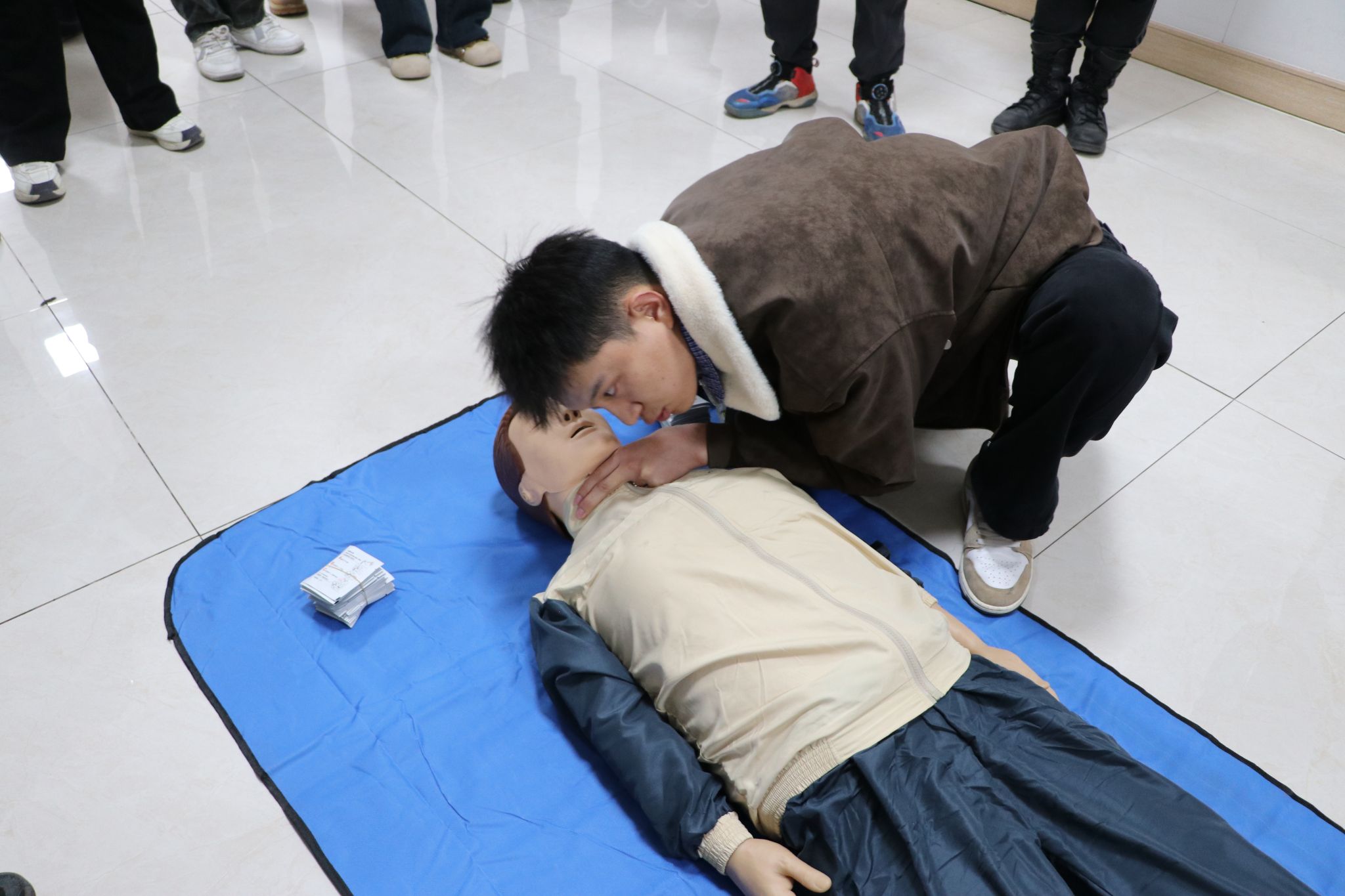 随后,教学组将学员分为若干小组,围绕不同专题展开实操。伤口包扎、海姆立克组聚焦气道异物梗阻、心肺复苏等。实操环节中,同学们在模拟人上轮流练习,教学组成员逐一检查按压位置、深度与频率,现场纠正偏差,帮助大家固化标准动作。